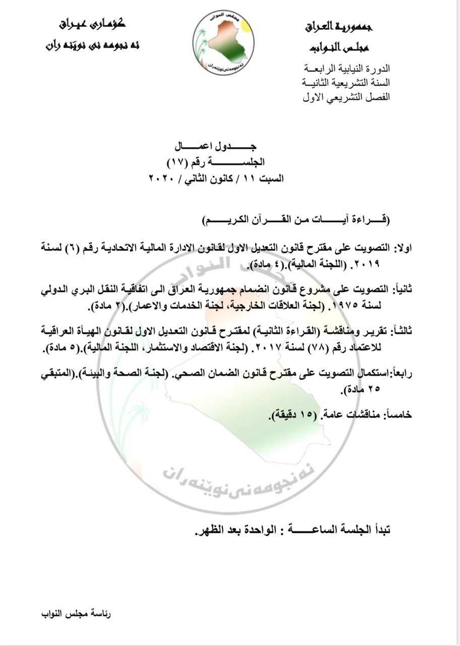 اعلن مجلس النواب جدول اعمال جلسته المقررة السبت المقبل.
