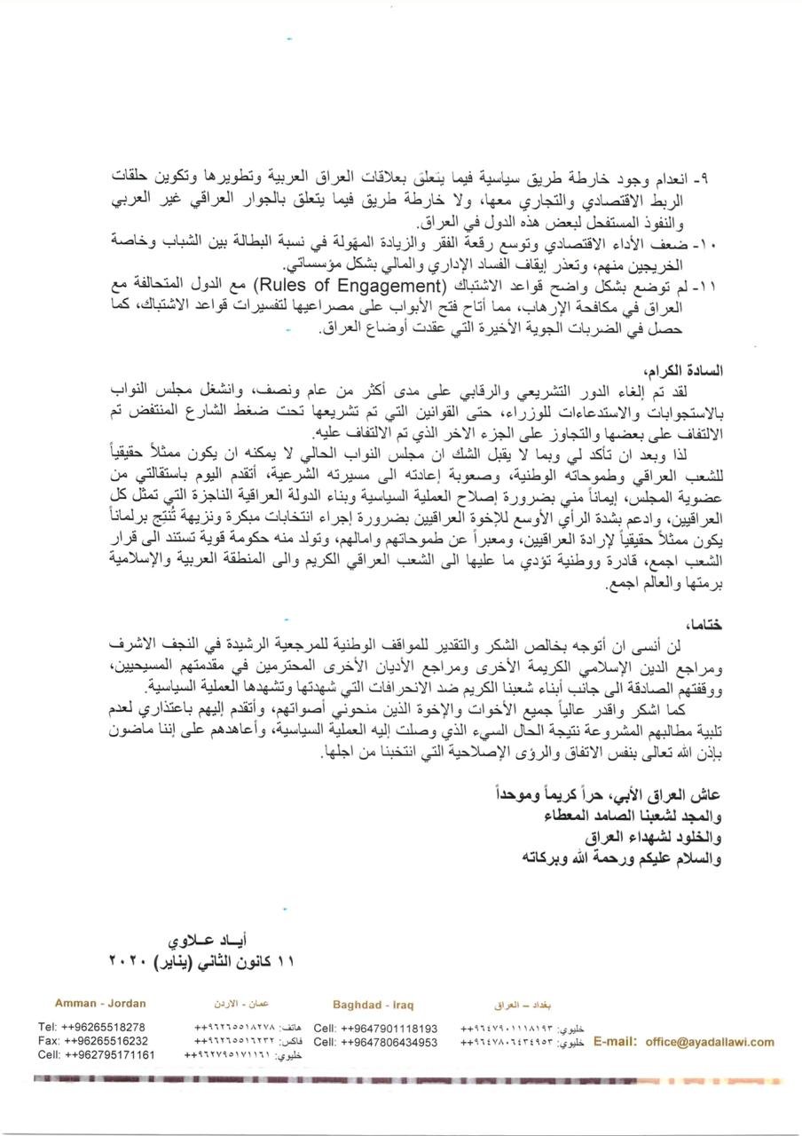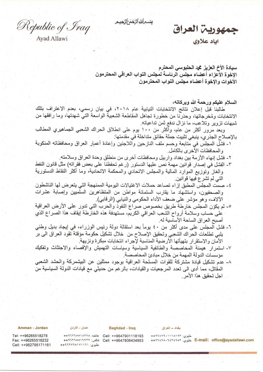 تنشر وكالة من كربلاء الخبر ، بالوثائق نص استقالة زعيم ائتلاف الوطنية اياد علاوي من عضوية مجلس النواب.