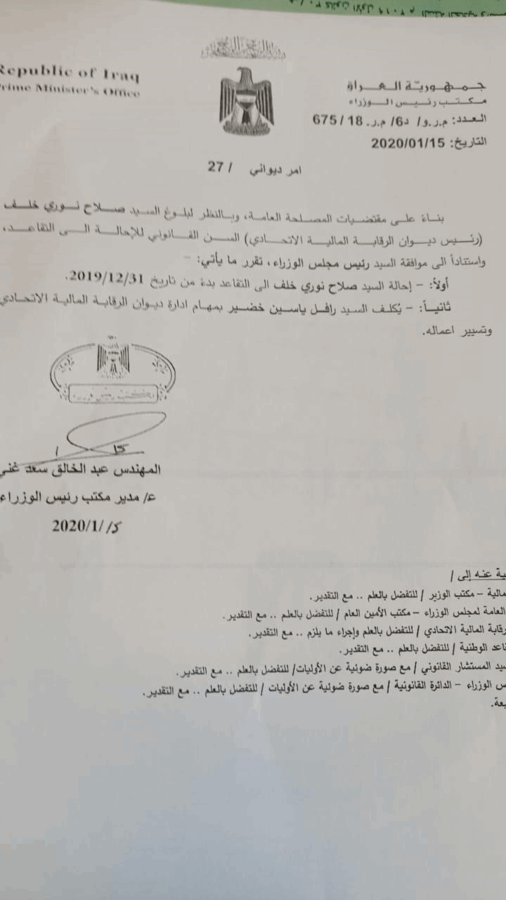 تنشر وكالة من كربلاء الخبر وثيقة تتضمن أمراً إدارياً يقضي بإحالة رئيس ديوان الرقابة المالية صلاح نوري خلف إلى التقاعد لبلوغه السن القانوني، وتكليف رافل ياسين خضير بمهام إدارة الديوان وتسيير أعماله