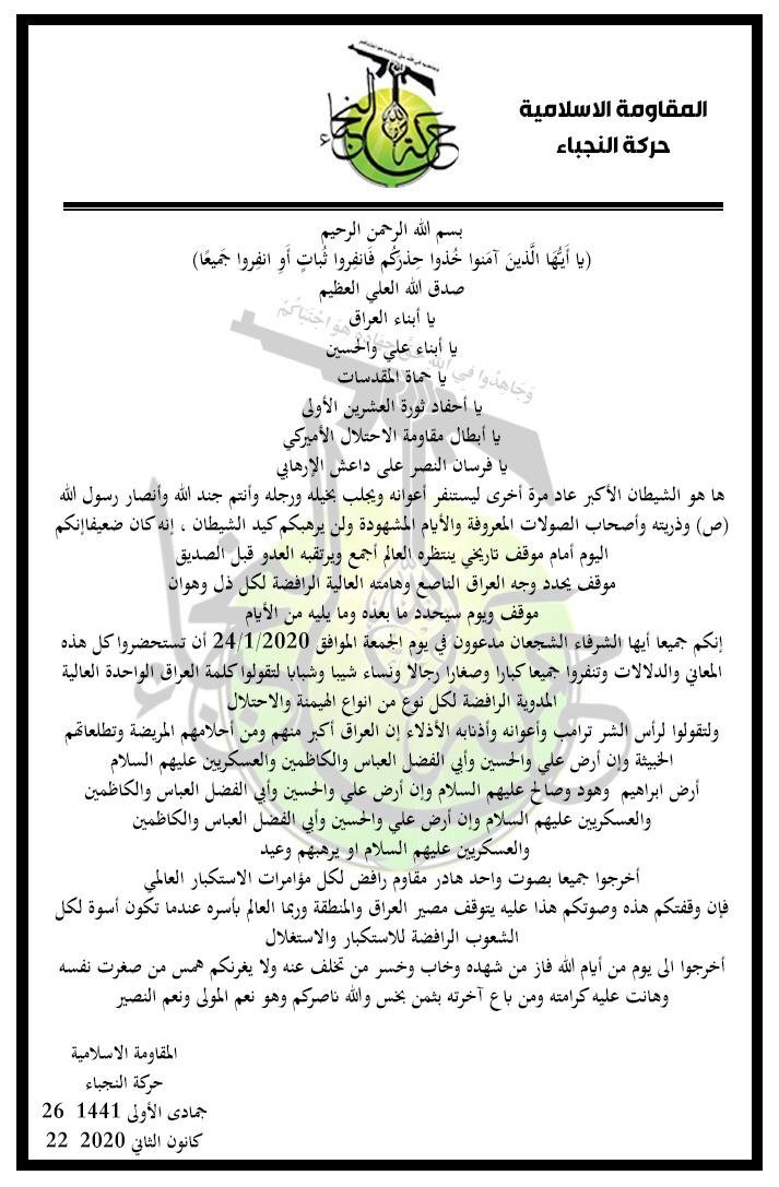 اصدرت حركة "النجباء"، الاربعاء، بيانا بشأن تظاهرات الجمعة المقبلة، فيما دعت الجميع الى الخروج بصوت واحد لرفض مؤامرات "الاستكبار العالمي".