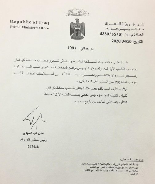 بالوثيقة.. عبد المهدي يكلف ناظم الوائلي محافظاً لذي قار