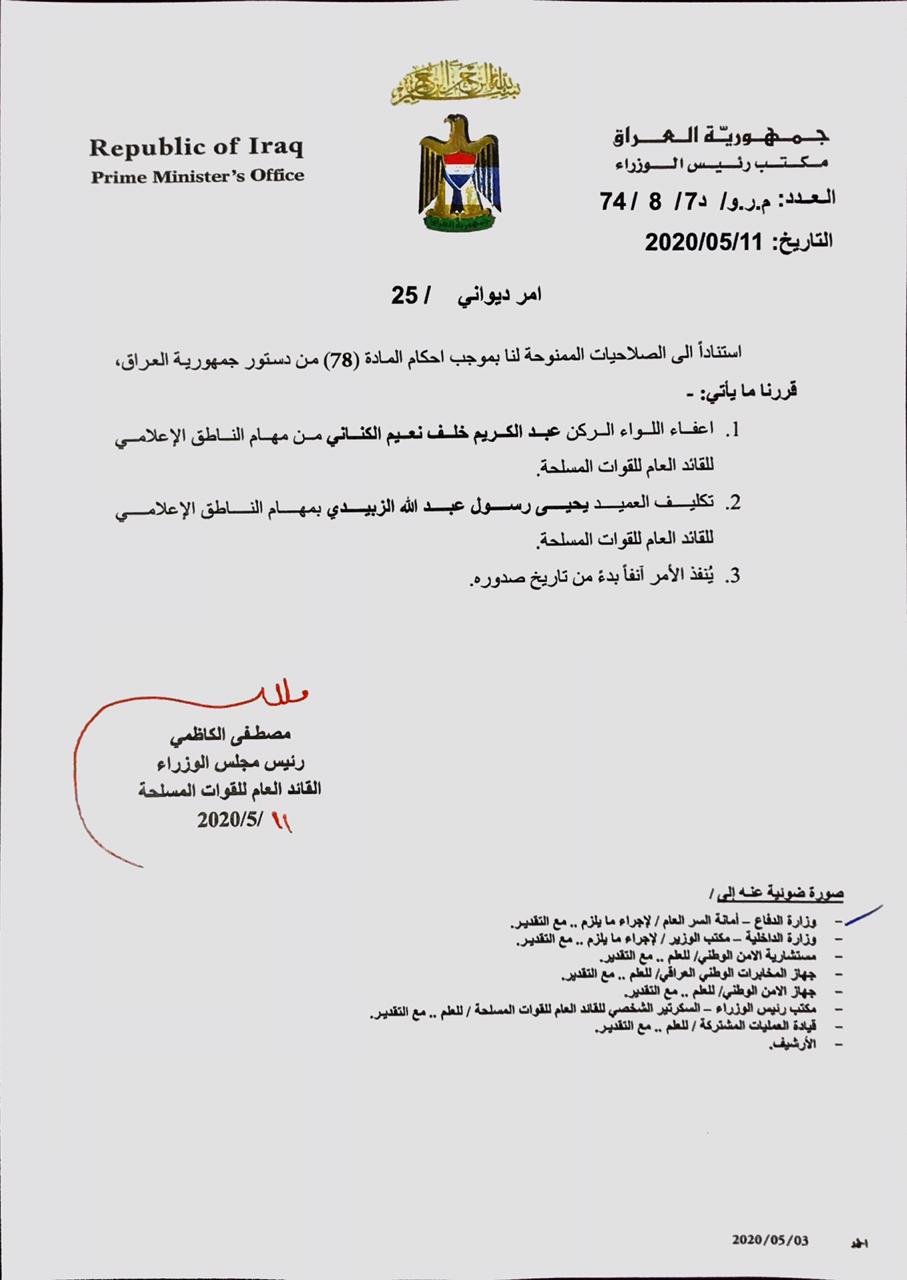 تنشر وكالة من كربلاء الخبر بالوثيقة، إعفاء القائد العام للقوات المسلحة مصطفى الكاظمي للناطق باسم القائد العام اللواء الركن عبد الكريم خلف وتكليف العميد يحيى رسول بدلاً عنه