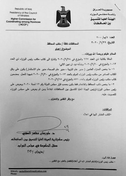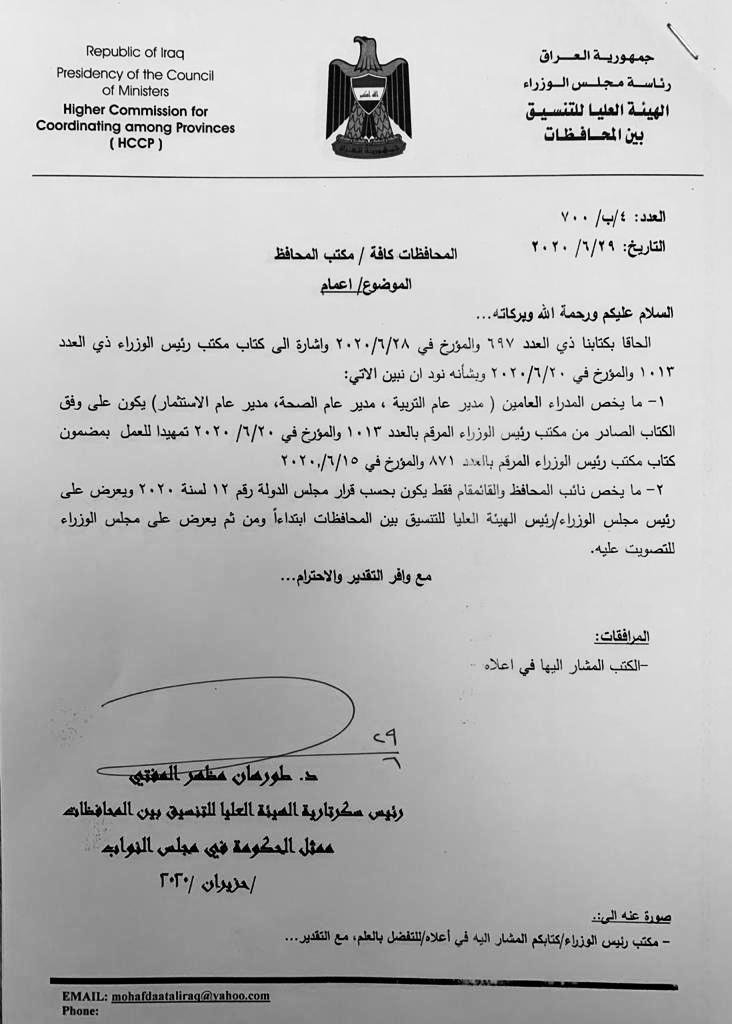وجه ممثل الحكومة في مجلس النواب طورهان المفتي، الاثنين، كتابا الى جميع المحافظات يتضمن عددا من التوجيهات.