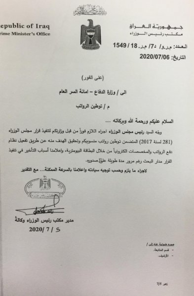 تنشر وكالة من كربلاء الخبر بالوثيقة، توجيه القائد العام للقوات المسلحة مصطفى الكاظمي وزارة الدفاع بالاجراء الفوري لتوطين رواتب منتسبي الوزارة.