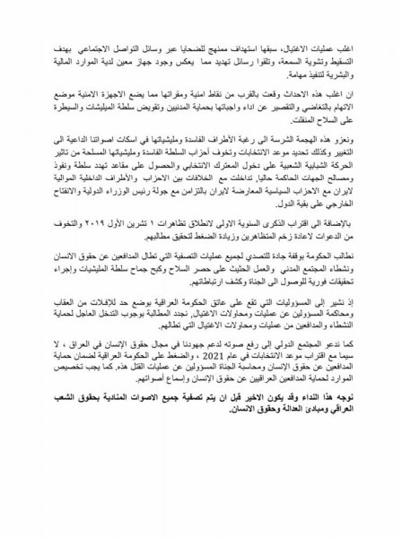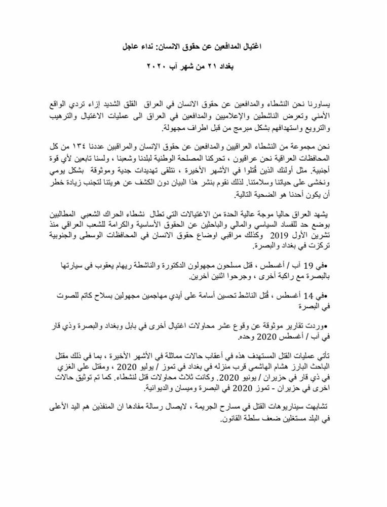 ونشر الناشطون بيانا عبروا فيه عن مخاوفهم من عمليات التحريض التي تجري على مواقع التواصل الاجتماعي، فيما أشاروا إلى تقارير موثوقة عن وقوع عشر محاولات اغتيال في بابل وبغداد والبصرة وذي قار خلال شهر آب الجاري.