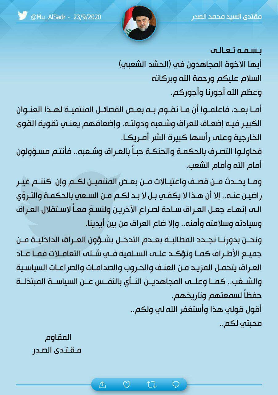 وجه زعيم التيار الصدري مقتدى الصدر، الاربعاء، رسالة الى الحشد الشعبي، معتبراً أن ما تقوم به بعض الفصائل المنتمية للحشد فيه اضعاف للعراق وشعبه ودولته