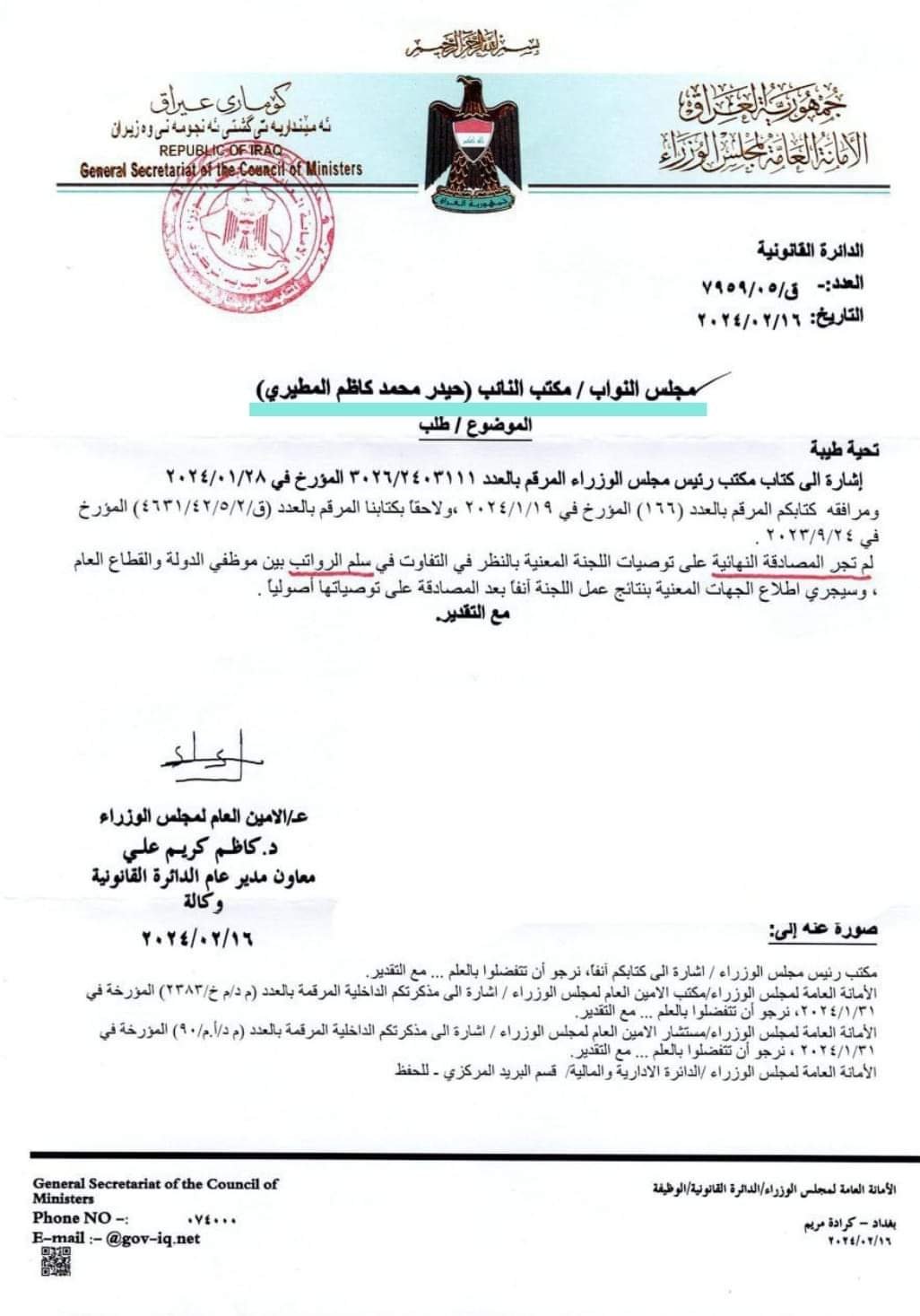 إجابة الأمانة العامة لمجلس الوزراء بشأن سلم الرواتب لموظفي الدولة