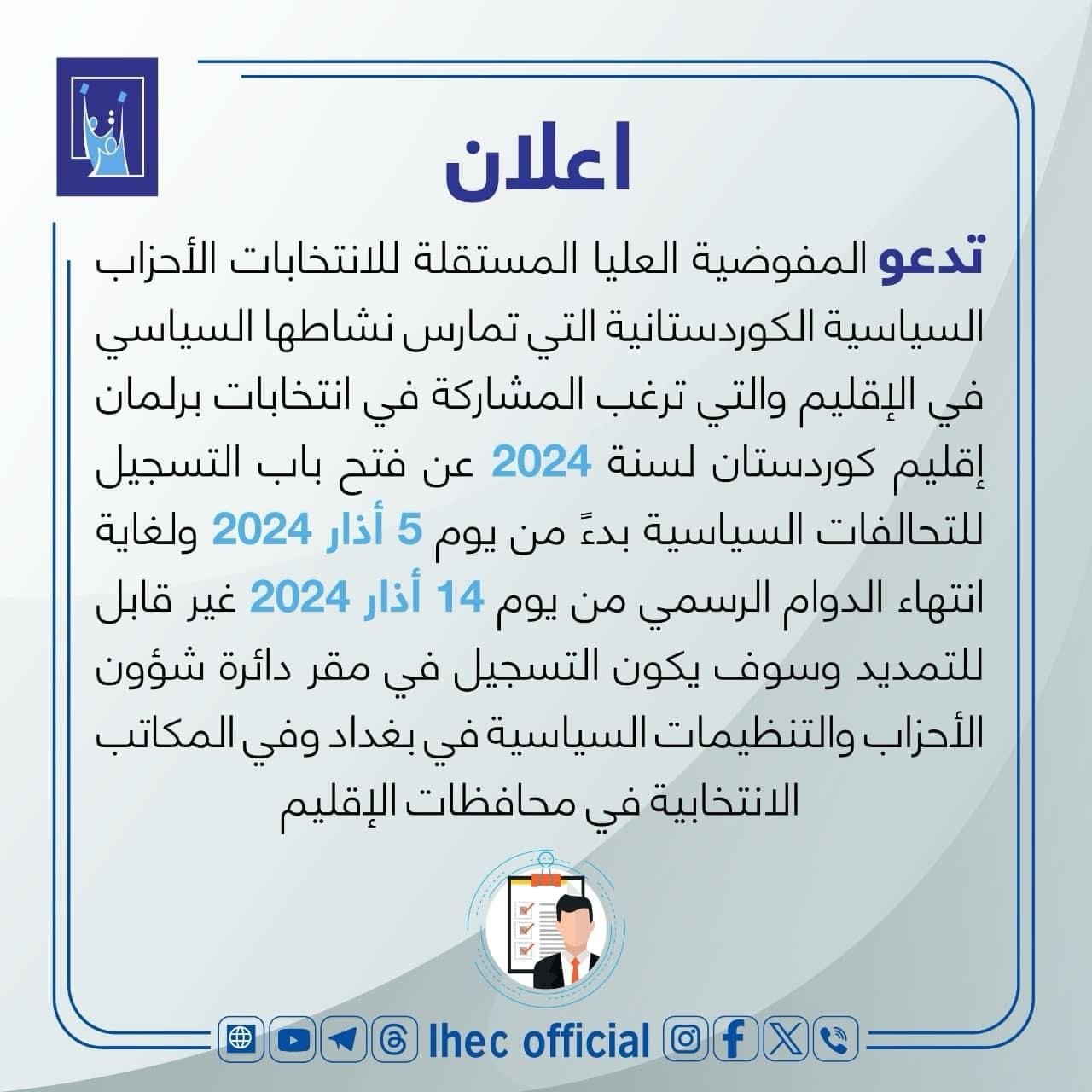المفوضية تفتح باب التسجيل للكيانات السياسية لانتخابات برلمان الاقليم