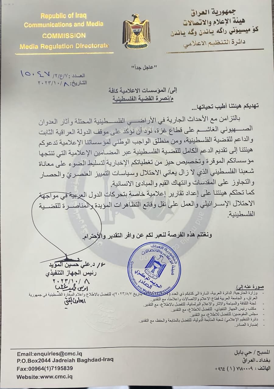 هيئة الإعلام والاتصالات تدعو المؤسسات الإعلامية كافة إلى تسليط الضوء على معاناة الشعب الفلسطيني