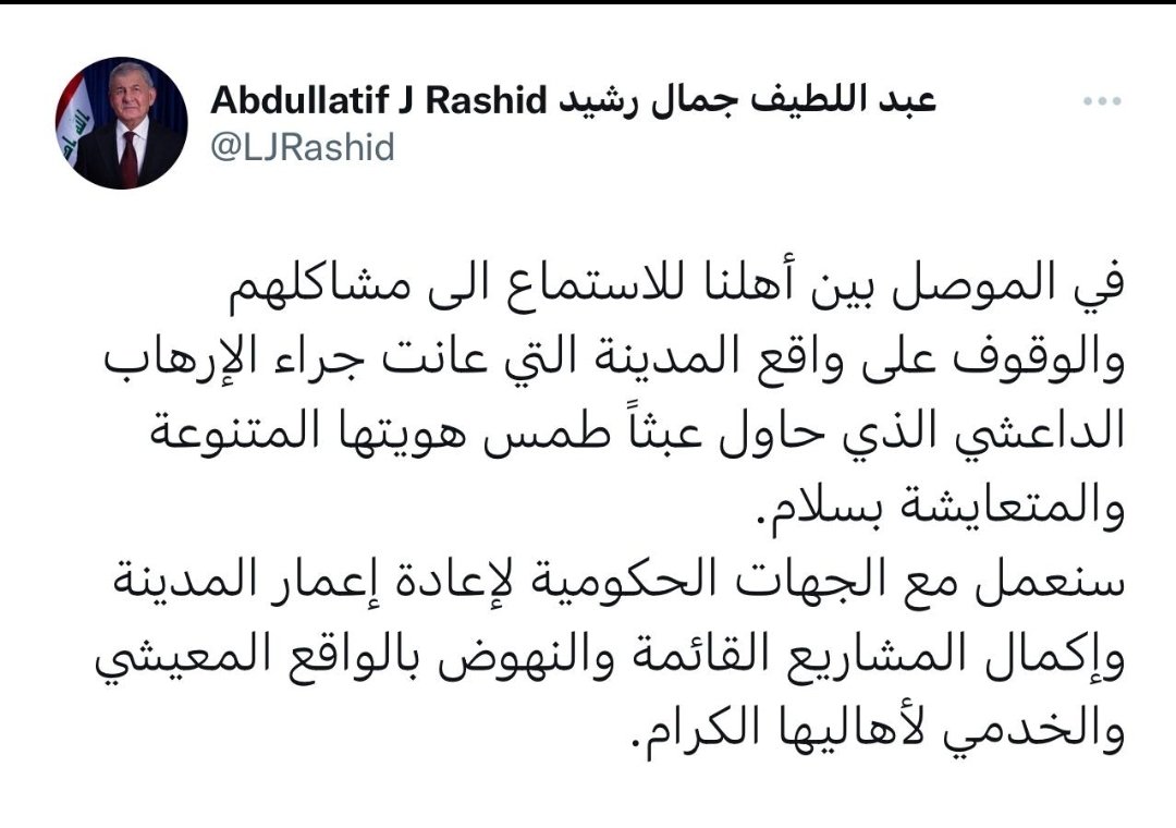 رئيس الجمهورية: سنعمل مع الجهات الحكومية لإعادة إعمار مدينة الموصل وإكمال المشاريع