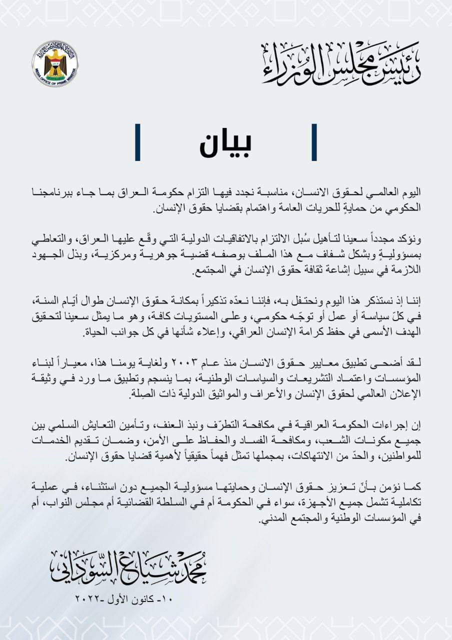 السوداني في اليوم العالمي لحقوق الانسان: نجدد التزام حكومة العراق بما جاء ببرنامجنا الحكومي من حمايةٍ للحريات العامة
