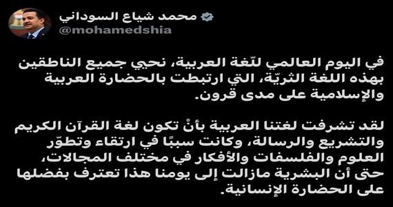 السوداني في اليوم العالمي للّغة العربية: لغتنا تشرفت بأنْ تكون لغة القرآن الكريم