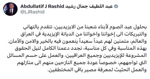 رئيس الجمهورية يهنئ الايزيديين ويجدد دعم الحقوق المشروعة لجميع العراقيين