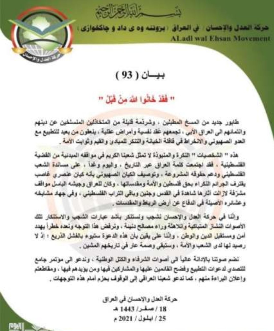 حركة عراقية تستنكر مؤتمر التطبيع وتدعو لفضح القائمين عليه