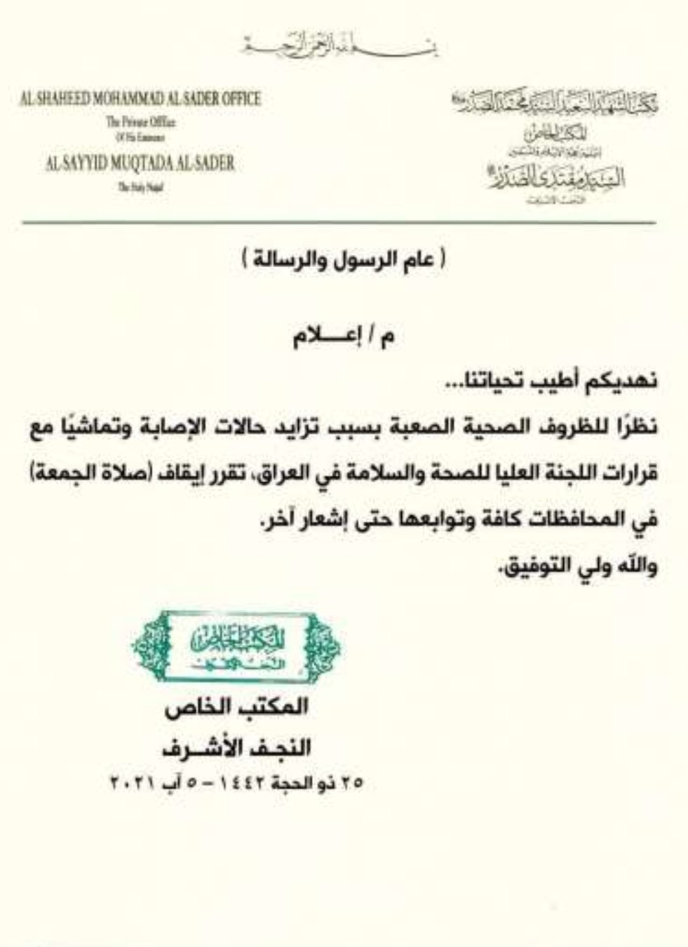 بالوثيقة.. التيار الصدري يوقف صلاة الجمعة