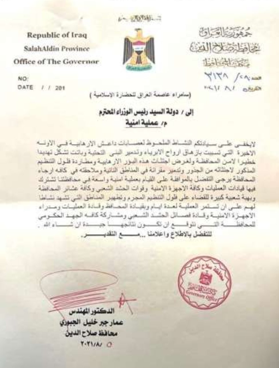 صلاح الدين توجه رسالة للكاظمي تخص أمن المحافظة (وثيقة)