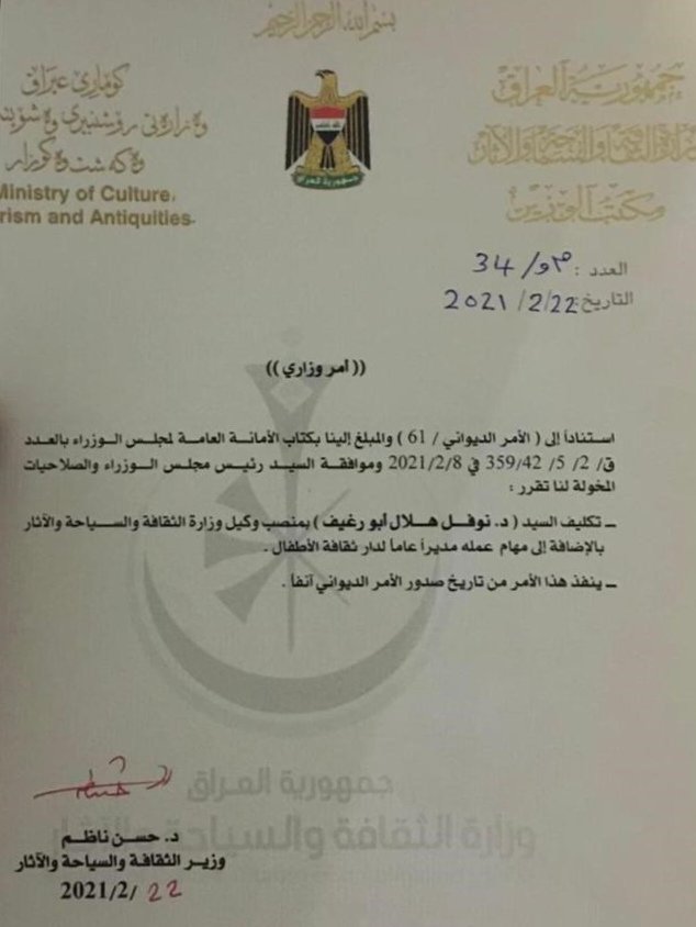 تكليف أبو رغيف بمهام وكيل وزارة الثقافة