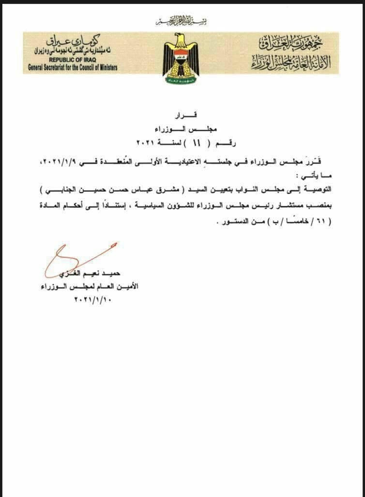 بالوثيقة.. تعيين “مشرق عباس” مستشارا سياسيا للكاظمي
