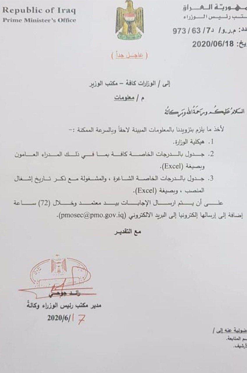 مكتب الكاظمي يطالب الوزارات بمعلومات مهمة خلال 72 ساعة