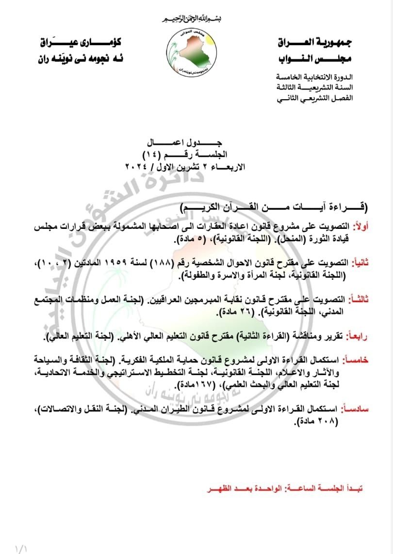 جدول أعمال مجلس النواب ليوم الأربعاء