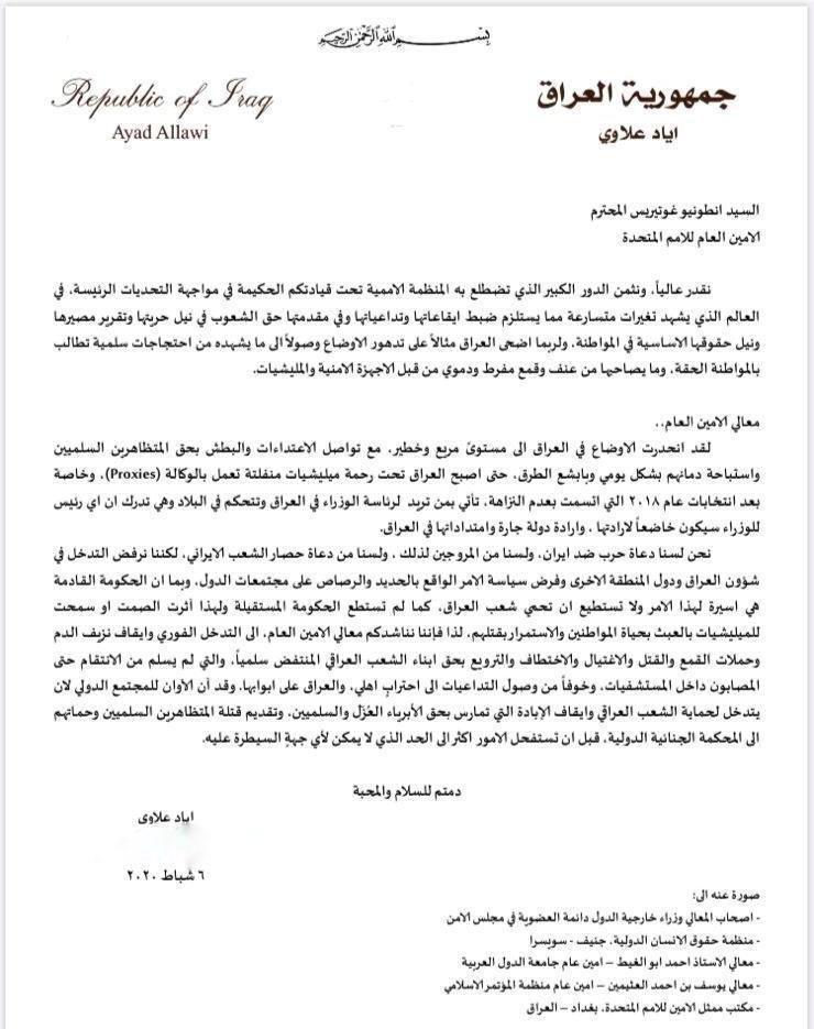 نص رسالة اياد علاوي الى أمين عام الامم المتحدة