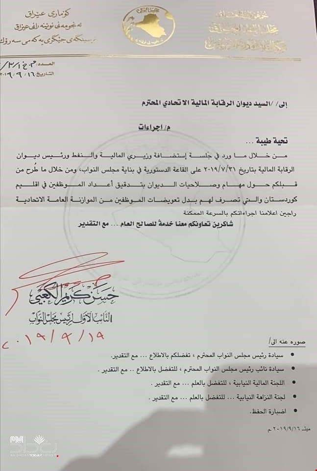 بالوثيقة هيئة رئاسة البرلمان تدعو ديوان الرقابة المالية لتدقيق أعداد موظفي اقليم كردستان
