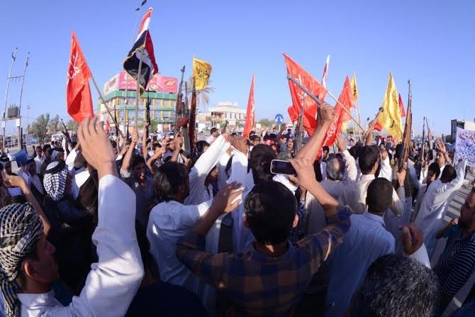 العشرات من متطوعي ذي قار يتظاهرون بكربلاء ويرددون شعارات تندد بالإرهاب