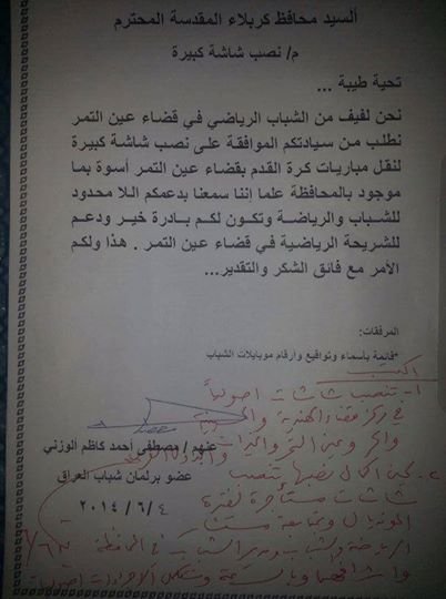 محافظ كربلاء عقيل الطريحي يوعز بنصب شاشات كبيرة في جميع اقضية ونواحي كربلاء المقدسة.