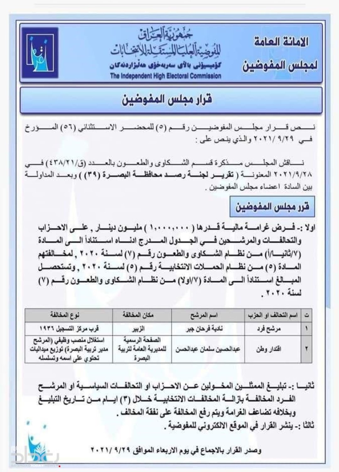 أعلنت المفوضية العامة المستقلة للانتخابات، اليوم السبت، فرض غرامة قدرها مليون دينار على مدير عام تربية البصرة، عبدالحسين سلمان، "لاستغلاله منصبه لاغراض الدعاية الانتخابية"،