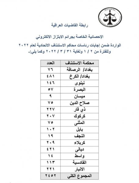 أصدرت رابطة القضاة العراقيين، اليوم السبت، الإحصائية الخاصة بجرائم الابتزاز الالكتروني، الواردة ضمن إجابات رئاسات محاكم الاستئناف الاتحادية، من الفترة من 2 كانون الثاني العام الحالي، الى 31 اذار منه.