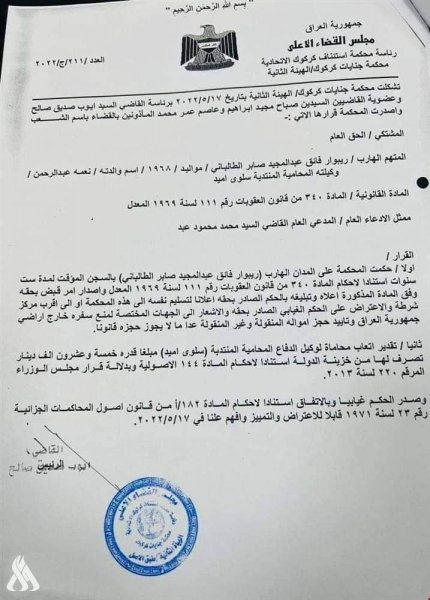 أصدرت محكمة جنايات كركوك، اليوم الثلاثاء، حكماً غيابياً على رئيس مجلس المحافظة ريبوار فائق عبد المجيد الطالباني.