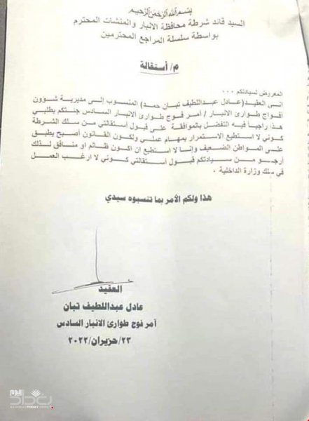 قدم امر فوج طوارئ الانبار السادس في الفلوجة العقيد عادل التبان، اليوم الجمعة، استقالته من سلك الشرطة.
