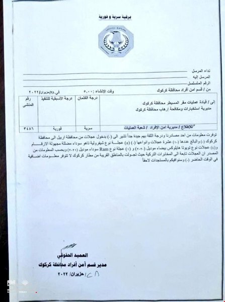 وتضمنت الوثيقة الموجهة من قسم امن افراد محافظة كركوك، ان عمليات المقر المسيطر في كركوك ابلغ بان عدد من العجلات التابعة الى المخابرات التركية دخلت قرب مطار محافظة كركوك.