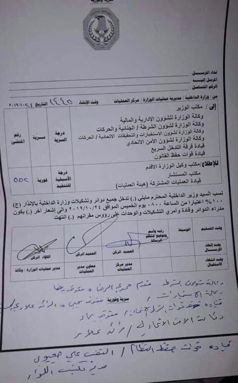 وتظهر الوثيقة توجيها من وزير الداخلية الى جميع مفاصل الوزارة بدخول حالة الانذار القصوى "ج" ١٠٠٪ اعتبارا من الساعة الثامنة من صباح يوم الخميس الموافق 24 تشرين الاول الحالي، وحتى اشعار اخر.