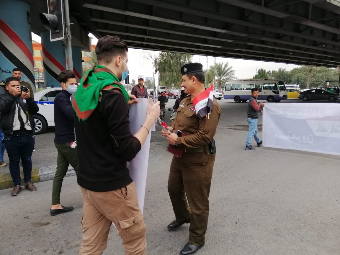 وزعت القوات الامنية في محافظة كربلاء، اليوم الاحد، الورود والأعلام العراقية على المتظاهرين وطلبة الجامعات الذين انضموا الى التظاهرات الاحتجاجية في المحافظة.