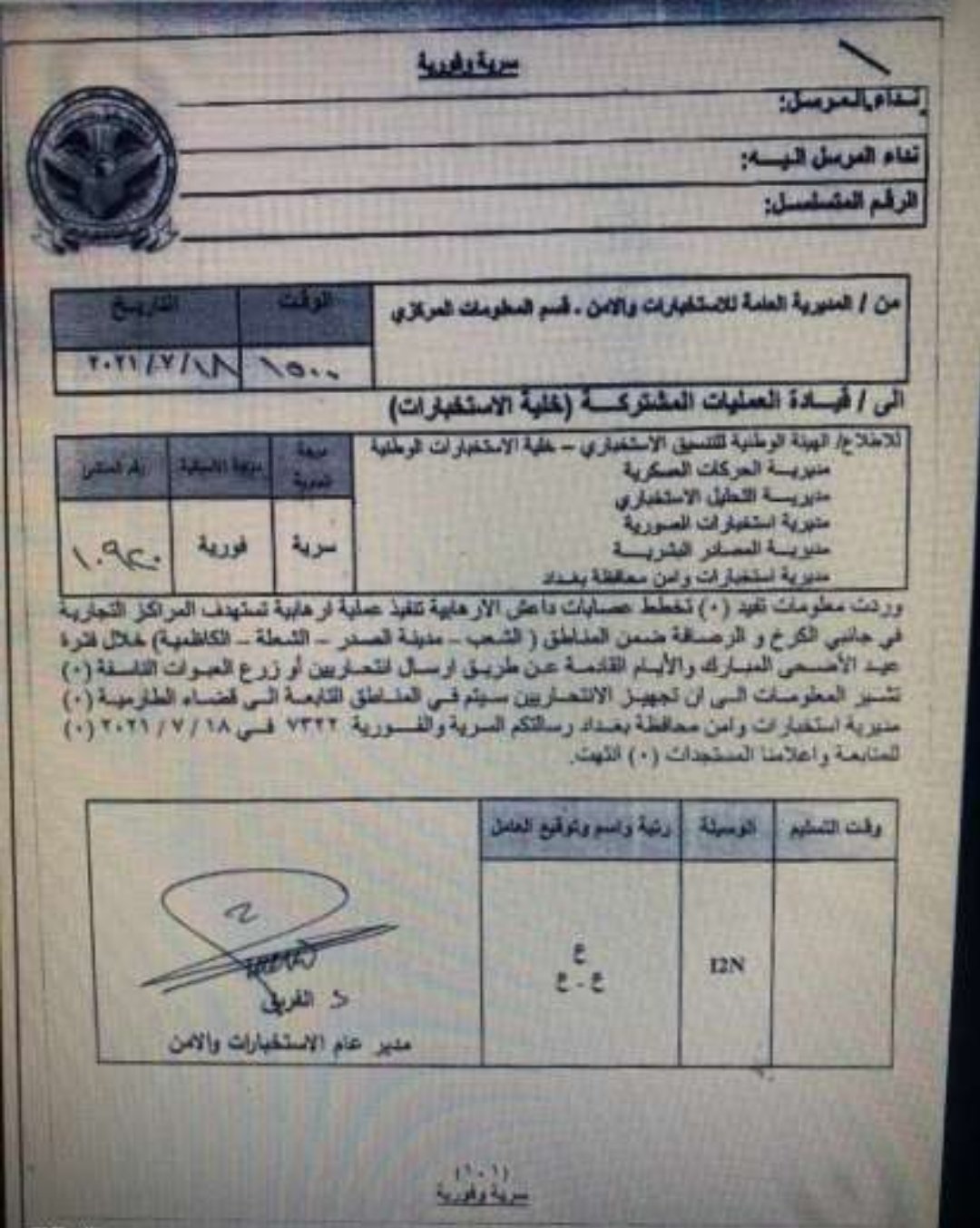 العراق.. بالوثيقة.. مديرية الاستخبارات حذرت يوم أمس من استهداف مدينة الصدر