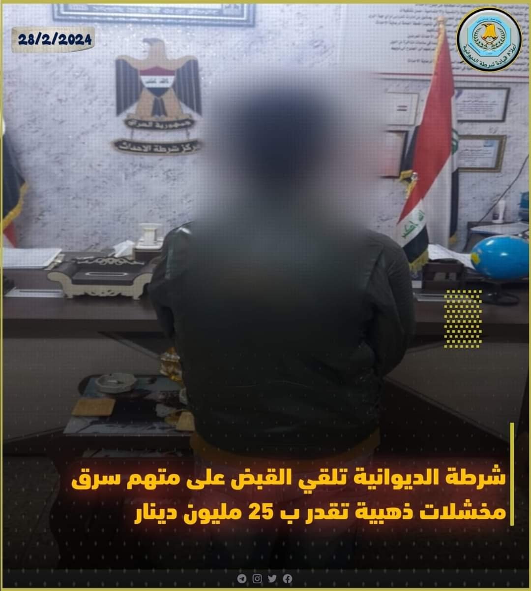 بقيمة 25 مليون دينار .. الإطاحة بسارق ذهب في الديوانية