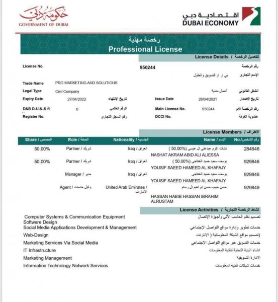 ولفت عدنان الى ان هذا يعني ان الشركة اذا ما كانت فقط بأسم يوسف الخفاجي المذكور اسمهُ أعلاه ولا يوجد اسم نشأت اكرم فذلك يعني ان أجرائهم قانوني وصريح جداً ، واذا ما وجد اسم نشأت أكرم فهذا يعني ان هناك كارثة ومخالفة قانونية كبيرة، مشددا في الوقت ذاته لو كان اسم نشأت أكرم موجود ولم تربطهُ علاقة بأياد بنيان عندها سيكون الأجراء صحيح جدا ومن حقهِ أن يكون شريكا وله أسهم بهذه الشركة، ولكن في الوقت الحاضر تختلف الأمور لاعتبار صلة القرابة التي تربط الطرفين.