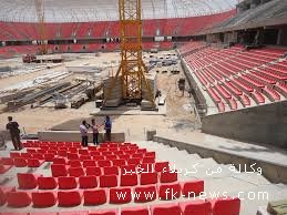 وتابع أن"   العمل حالياً وصل الى مراحل بناء القواطع الداخلية في غرف اللاعبين والحكام والقاعات الداخلية أسفل مدرجات الملعب ‘ وكذلك أعمال صب أسطح الملعب للمستوى الثالث".